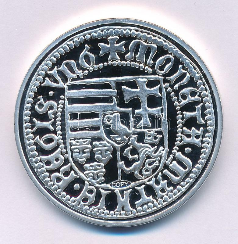 DN "A legértékesebb magyar érmék - Hunyadi Mátyás ezüst garasának replikája" ezüstözött Cu emlékérem kapszulában, "COPY" jelzéssel, színes tájékoztatóval (40mm) T:PP