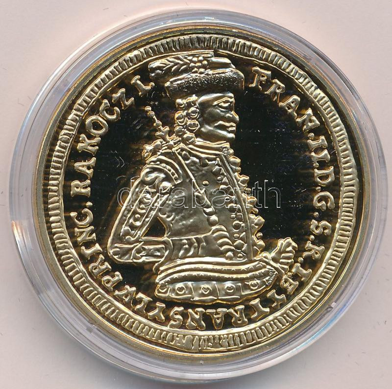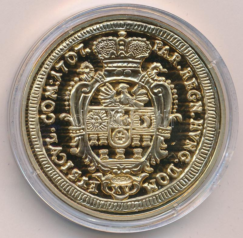 DN "A legértékesebb magyar érmék - II. Rákóczi Ferenc arany, 1707 replika" aranyozott Cu emlékérem kapszulában, "COPY" jelzéssel, színes tájékoztatóval (40mm) T:PP
