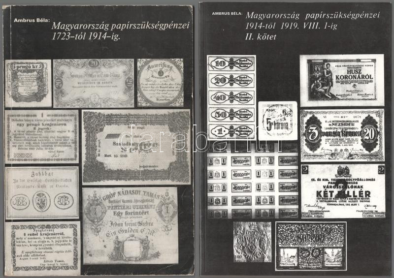 Ambrus Béla: Magyarország papírszükségpénzei 1723-tól 1914-ig. Budapest, 1977, Magyar Éremgyűjtők Egyesülete. + Ambrus Béla: Magyarország papírszükségpénzei 1914-től 1919. VIII. 1-ig. II. kötet. Magyar Éremgyűjtők Egyesülete, Budapest, 1986. A kötetek használt, de jó állapotban.