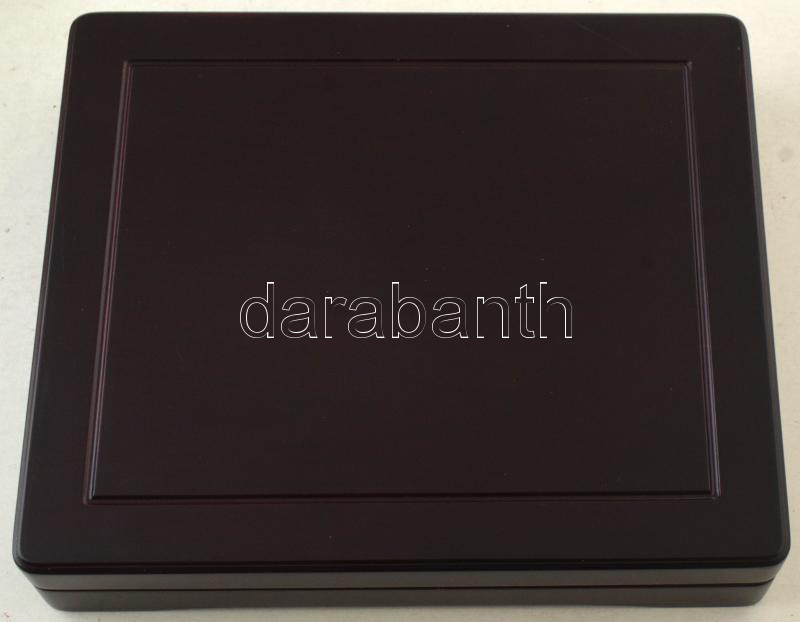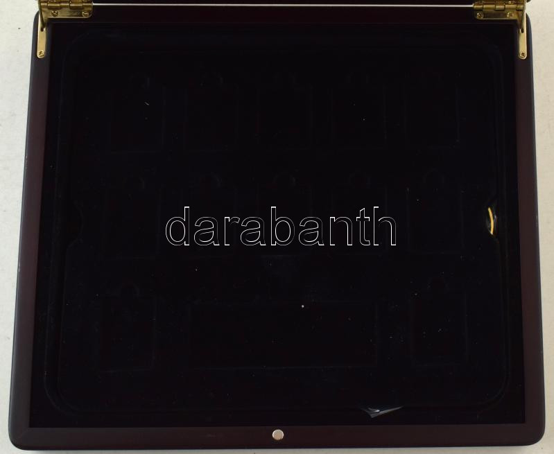 Mahagóni érmetartó kazetta bársonybéléssel, 1db kivehető tálcával, összesen 12db ~30x40mm-es, és 1db ~100x35mm-es férőhellyel. Benne dekoratív nagyító. Használt de újszerű állapotban.