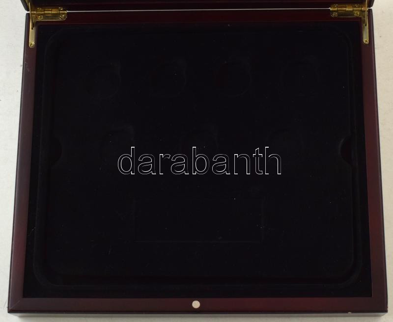 Leírás: Mahagóni fa érmetartó kazetta bársonybéléssel, 7db 30mm-es férőhelyű kivehető tálcával, újszerű állapotban, a kazetta külsején karcolásokkal.
