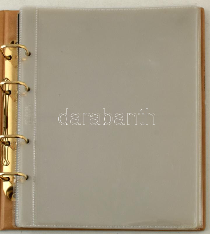 Négygyűrűs, barna műbőr "Numis Briefe" album, benne 11db kettesosztású- és 10db osztatlan berakólappal, bankjegyek vagy bliszterek tárolására. Használt de jó állapotban