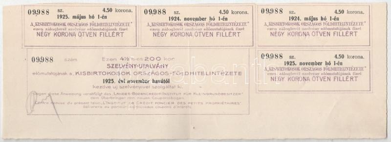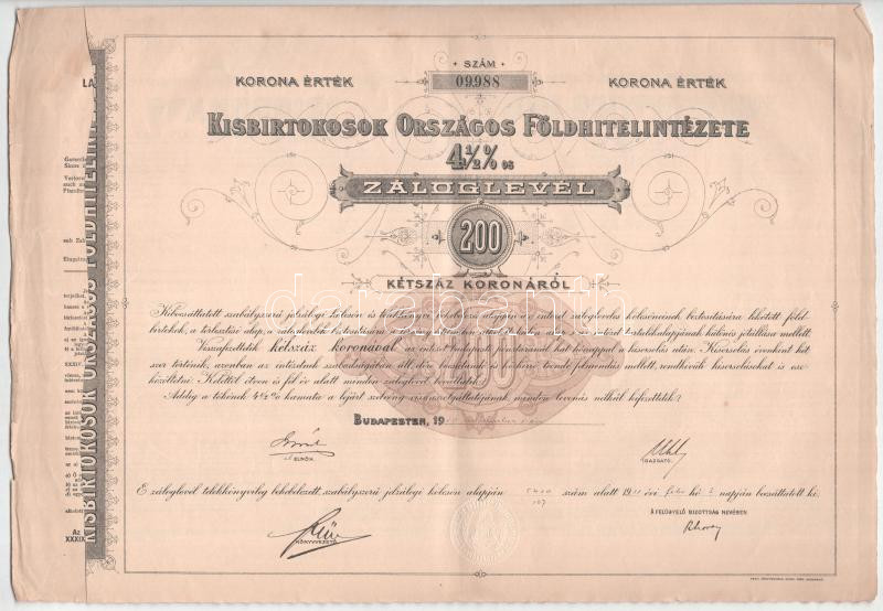 1910. Budapest "Kisbirtokosok Országos Földhitelintézete" 4 1/2%-os záloglevele 200K-ról, magyar, német és francia nyelven, szárazpecséttel, szelvényekkel T:F