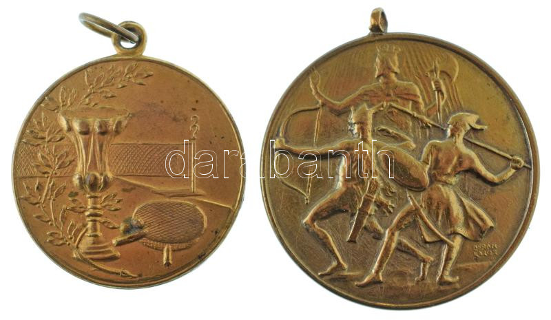 Leírás: 1942. "Leventeverseny " kétoldalas bronz díjérem, gravírozás lekoptatva. Szign.: "Berán" + DN "Asztalitenisz / III. " kétoldalas, aranyozott bronz díjérem T:VF, karc