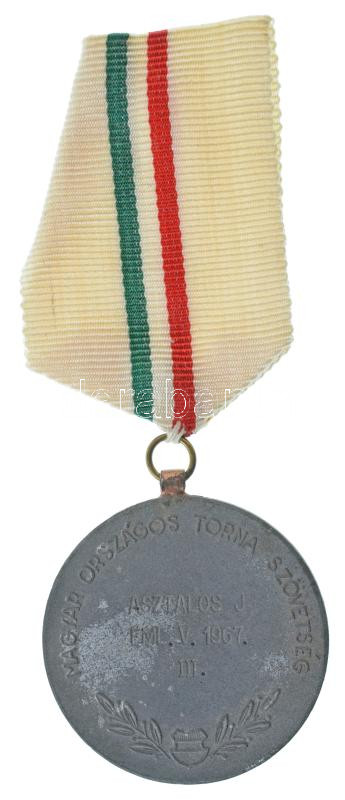 1967. "Magyar Országos Torna Szövetség - ASZTALOS J. EML. V. 1967. III." kétoldalas Zn díjérem, nem eredeti füllel, szalagon. Szign.: "D. L." (43mm) T:XF, kis oxidáció