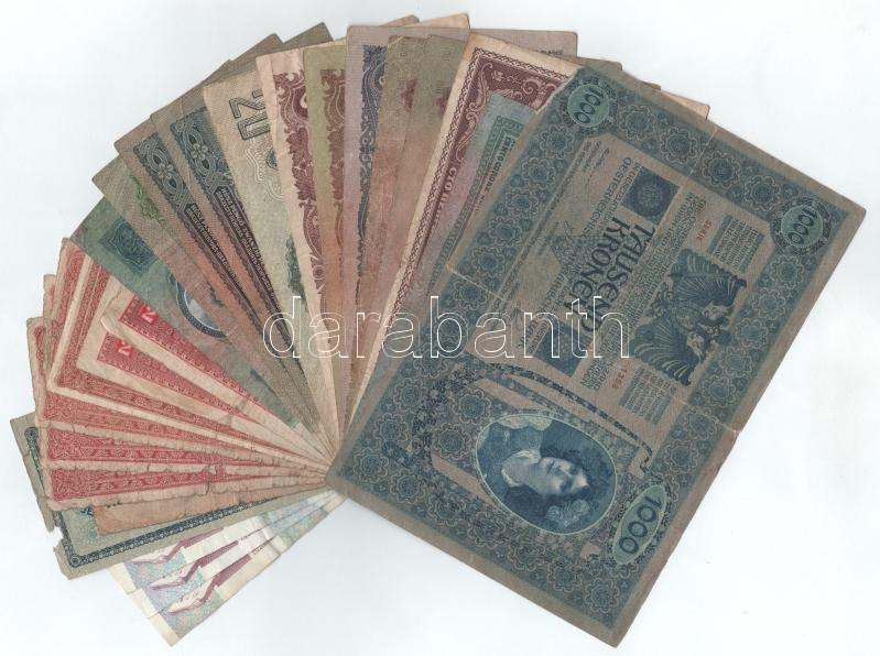 Vegyes, 25db-os magyar forint - pengő - korona és osztrák korona tétel, közte 1902. 1000K piros "MAGYARORSZÁG" felülbélyegzéssel, sarokhiánnyal + 1944. 20P "A Vöröshadsereg Parancsnoksága", stb. + közte 3db Olaszország 1990. 1000L T:F,VG, közte pár G