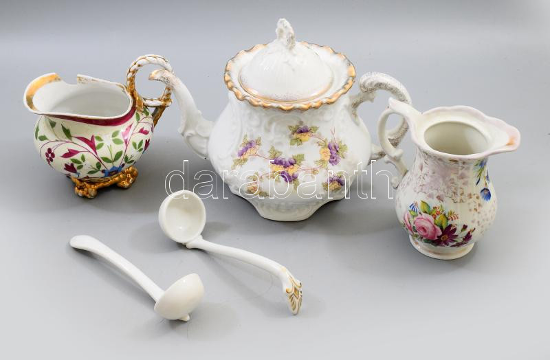 Leírás: 5 darabos szecessziós porcelán tétel, kanna, kiöntő, kanalak, közte sérüléssel, m:19 cm alatt