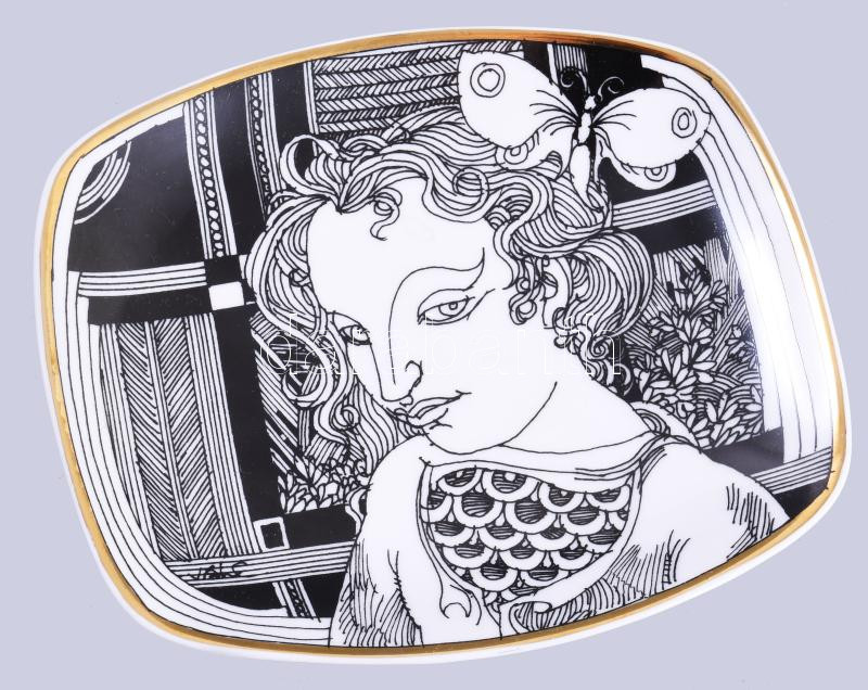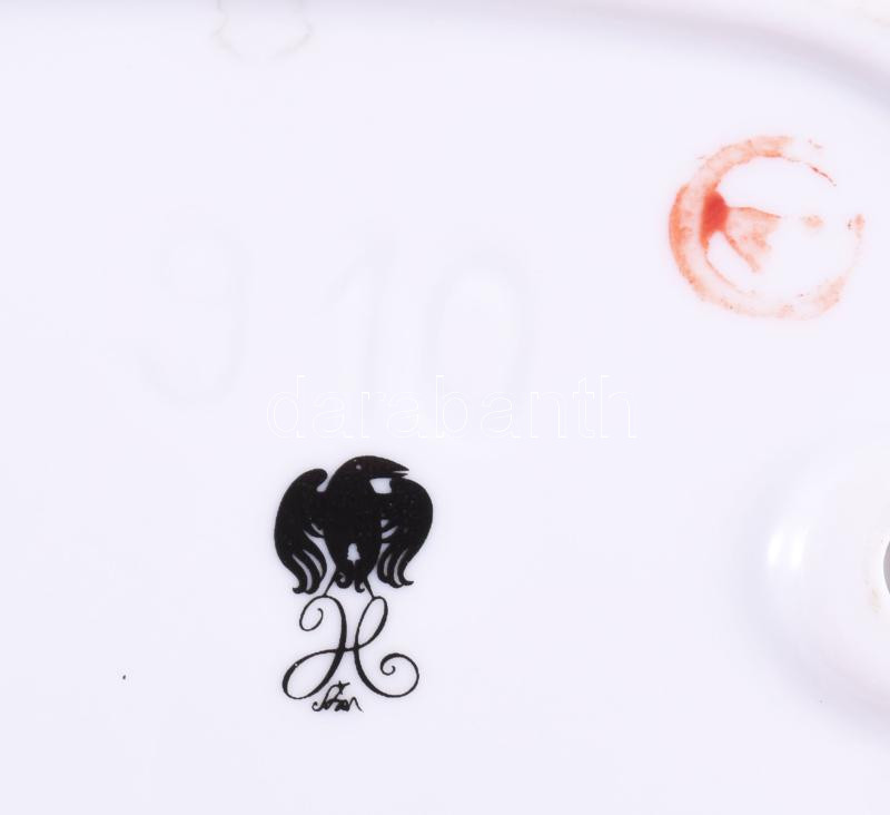 Leírás: Hollóházi Szász Endre által tervezett tálka. Matricás, jelzett, hibátlan, 14,5x12 cm