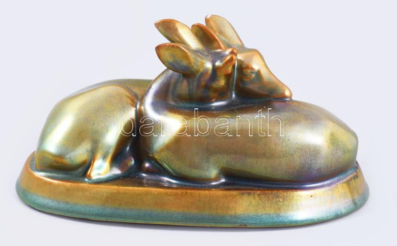 Leírás: Zsolnay kisplasztika - Őzpár. Eozin mázakkal fedett finomfajansz, jelzett, fülön felületi sérüléssel, 15x8 cm