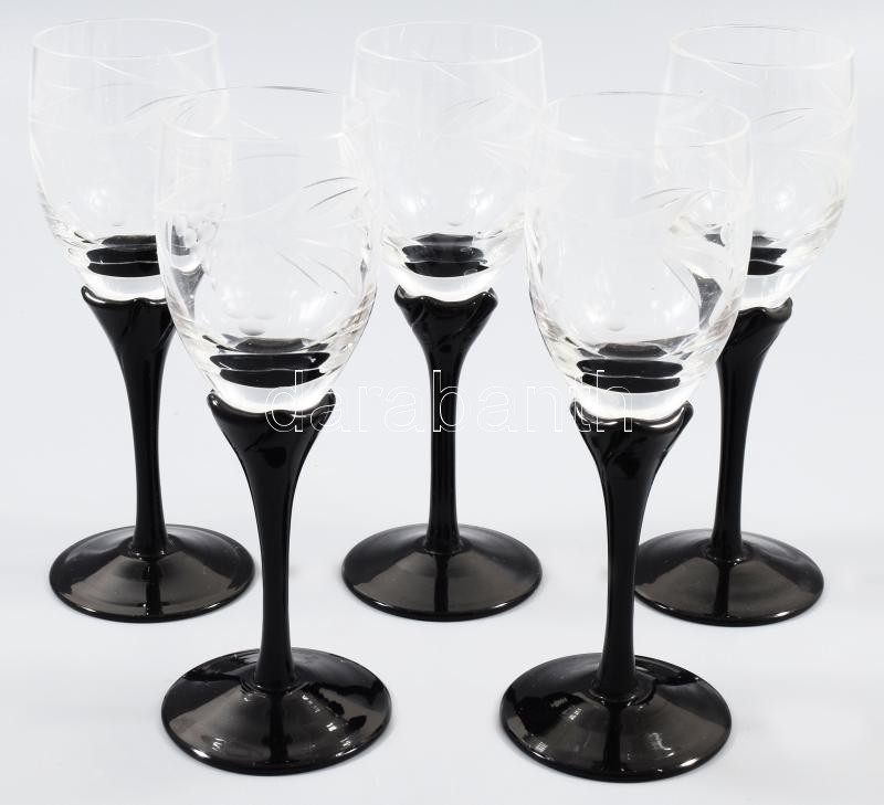 Leírás: Ajka kristály 5 darabos feketeüveg talpú pohár szett, jelzés nélkül, minimális pattogzással, m: 14,5 cm