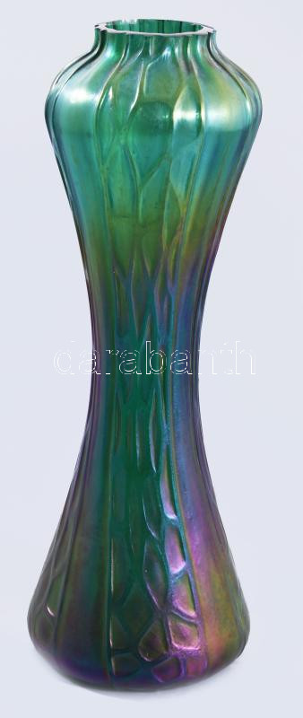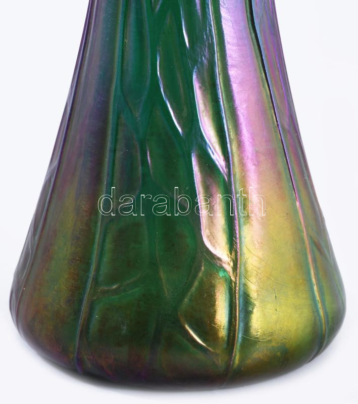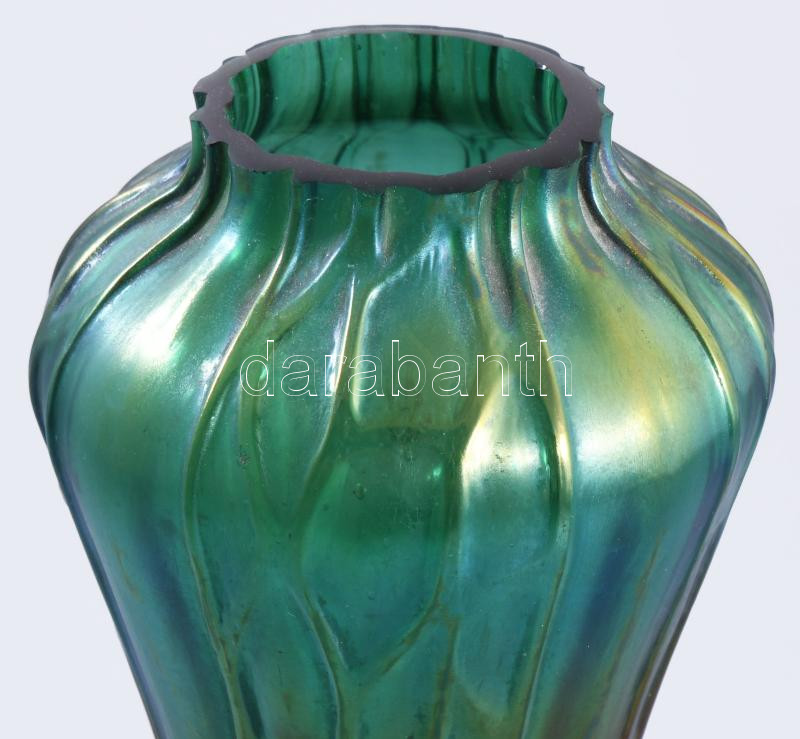 Jugendstil Lötz jellegű váza. Irizáló zöld hutaüveg plasztikus, üvegszál díszítéssel.. Jelzés nélkül, száján belül egy egészen minimális pattogzással. 20 cm