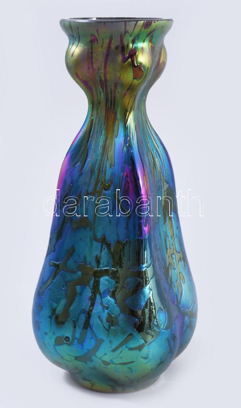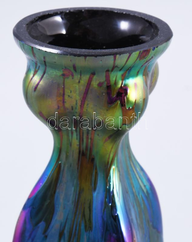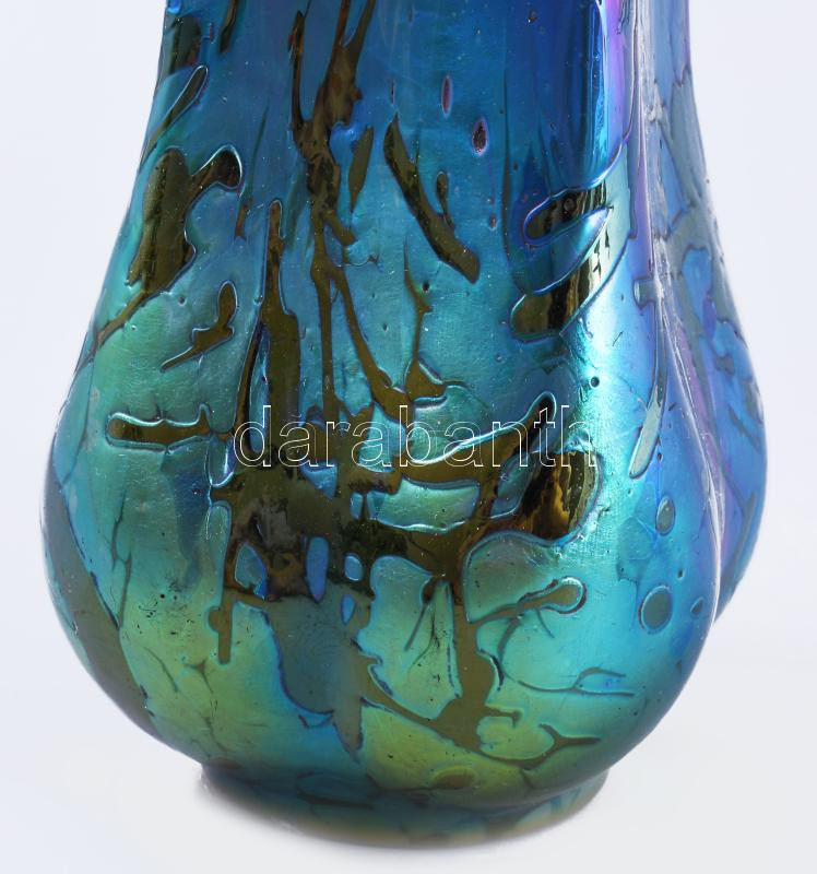 Leírás: Loetz / Rindskopf fémlüszteres felületű hialitüveg váza, jelzés nélkül, szájánál kis pattogzással, m: 17,5 cm