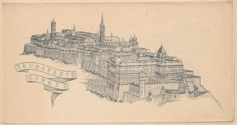 Leírás: Jelzés nélkül: Budapest (várnegyed), 1963. Rézkarc, papír. Néhány apró lapszéli folttal. 7×13,5 cm.