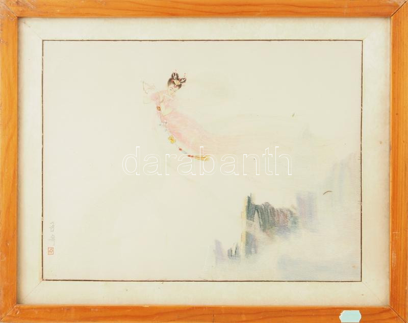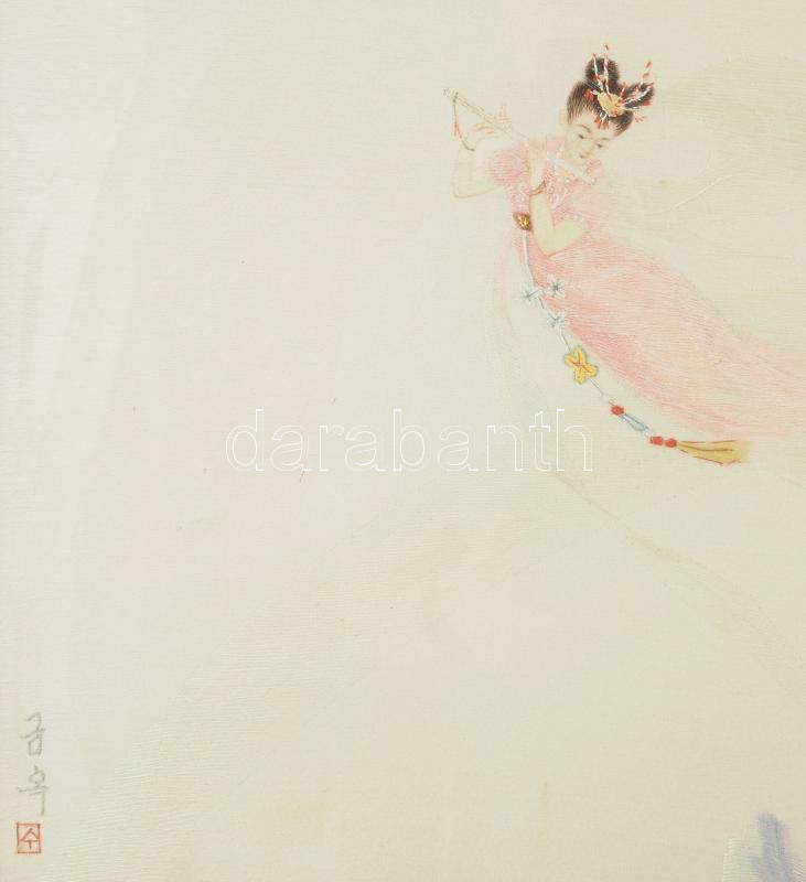 Leírás: Olvashatatlan jelzéssel, távol-keleti alkotó: Fuvolázó tündér. Vegyes technika, selyem. Üvegezett fakeretben, üvegen repedéssel. 24x32 cm.