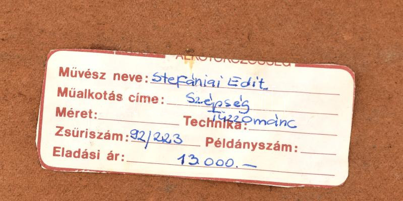 Stefániay Edit (1936 - ): Szépség. Tűzzománc kép fém lemezen, bőr kere... https://www.darabanth.com/hu/511-Festmeny-grafika-plakat-ex-libris-arveres/511.0/Festmenyek-es-grafikak/Festmenyek-es-grafikak~8/Stefaniay-Edit-1936-Szepseg-Tuzzomanc-kep-fem-lemezen-bor-keretben-jelzett-a-hatol~II3210050