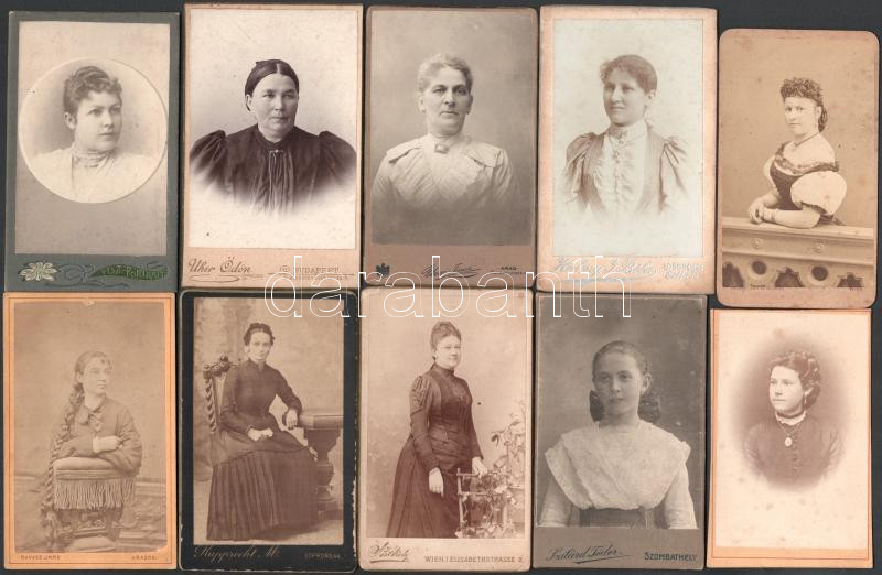 10 db hölgyeket ábrázoló vizitkártya, különféle műtermekből (közte Ravasz Imre, Arad; Rupprecht Mihály, Sopron; Szilárd Tódor, Szombathely; stb.), változó állapotban