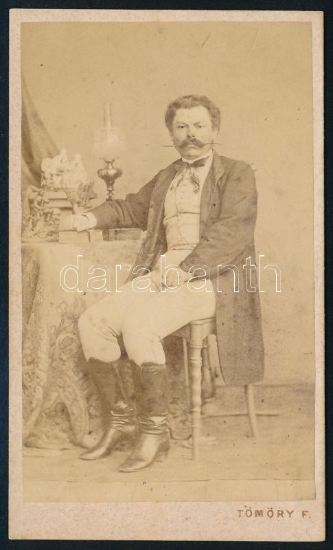 Leírás: cca 1865 Férfi műtermi portréja, keményhátú fotó Tömöry Ferenc zalaegerszegi műterméből, 10,5×6,5 cm