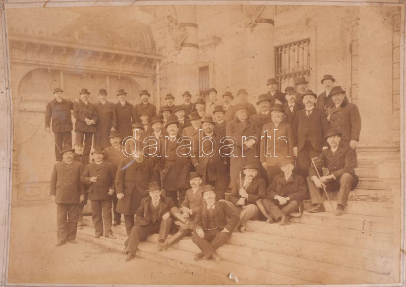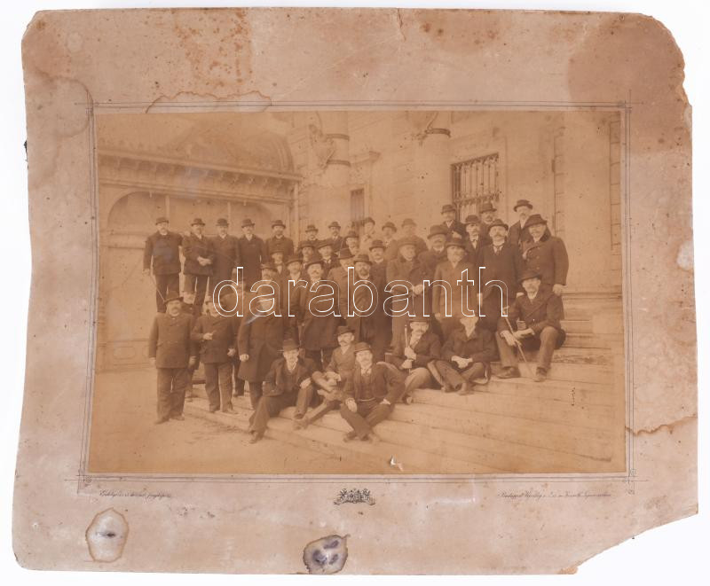 cca 1898 ,,Orosházi iparosok Thék Endrénél Budapesten", nagyméretű, kartonra kasírozott fotó Erdélyi cs. és kir. udvari fényképész budapesti műterméből, a hátoldalon feliratozva, foltos, sérült karton, 28x39 cm, teljes méret: 43x49,5 cm