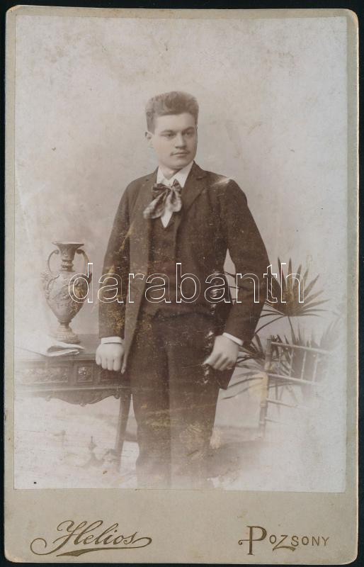cca 1900 Elegáns fiatalember portréja, kabinetfotó a pozsonyi Helios műteremből (,,Andrássy Gyula utcza 7. és Lörinczkapu utcza 8. sz."), kissé kopottas, 16,5x10,5 cm (Ritka!)