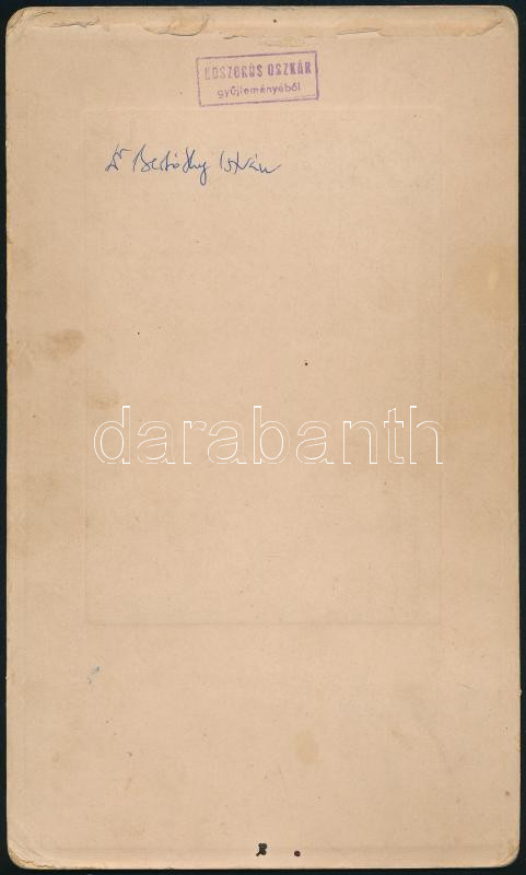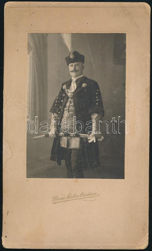 cca 1910 Berthóty István (1872-1929), az orosházi járás szolgabÃrája, Békés vármegye fÅ‘jegyzÅ‘je, kormányfÅ‘tanácsos, Békéscsaba polgármestere (1918-1929) dÃszmagyaros portréja. Keményhátú fotó Rónai Márton orosházi műtermébÅ‘l, kissé viseltes, foltos karton, a verzón Koszorús Oszkár orosházi helytörténész gyűjteményi bélyegzÅ‘jével, 25x15 cm