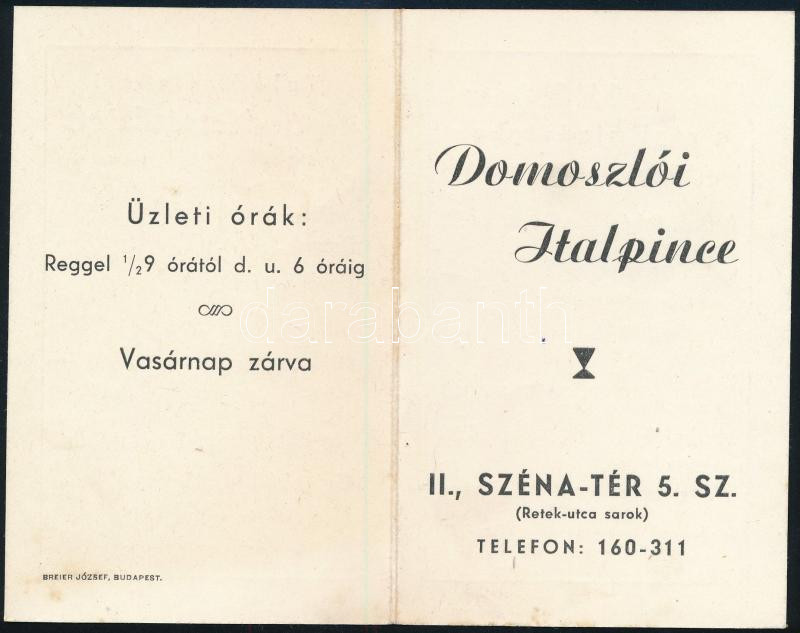 Domoszlói Italpince (Bp. II., Széna-tér 5.) ital árjegyzék, 2 sztl. le...