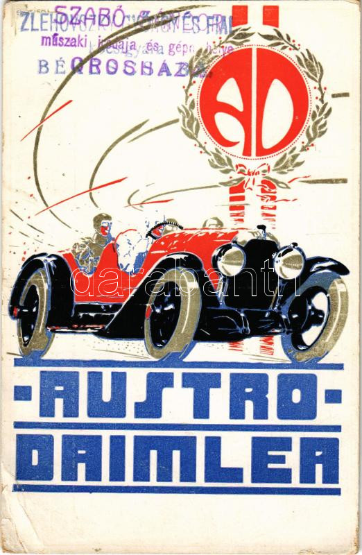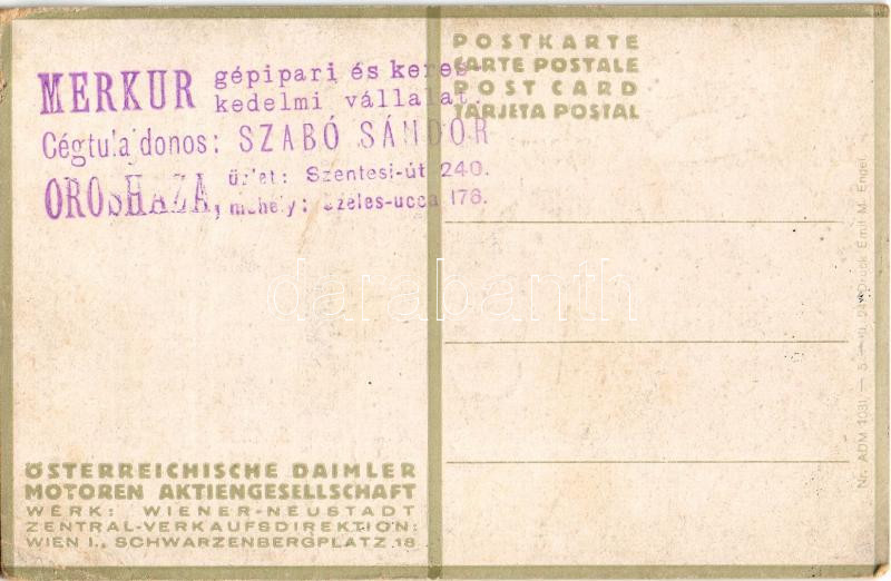 Austro Daimler, Oesterreichische Daimler Motoren Aktiengesellschaft / Austro Daimler reklámlap, automobil / automobile advertisement + "Zlehovszky György és Fiai kocsigyára Békéscsaba" "Szabó Sándor műszaki irodája és gépműhelye Orosháza" "Merkur gépipari és kereskedelmi vállalat cégtulajdonos: Szanó Sándor Orosháza" (EB)