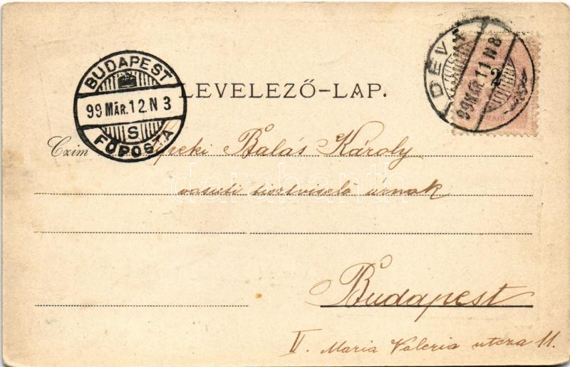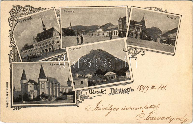 1899 Déva, Vármegyeháza, Piactér, Fő utca, Déva vára, Vajdahunyad vára. Hirsch Adolf kiadása / county hall, market square, main street, castle, castle in Hunedoara. Art Nouveau, floral (EK)