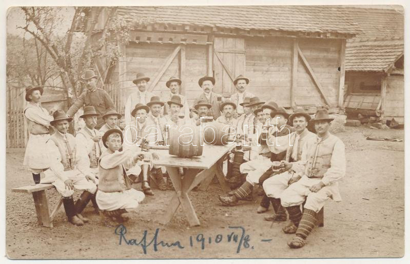 1910 Rafna, Raffna, Ramna; népviseletbe öltözött férfiak hordókkal. A levél címzettje Győry Lóránd miniszteri tanácsos / man in folk costumes, barrels. photo (EK)