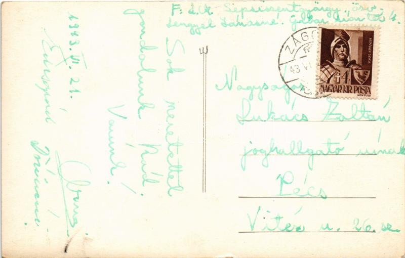 1943 Zágon, Zagon; Állami iskola, Községháza, Református templom, Római katolikus templom, Mikes malom, Mikes Kelemen tölgyfái, látkép / school, town hall, Calvinist church, Catholic church, mill, oak trees, general view. Foto Nagy photo (kis szakadás / small tear)