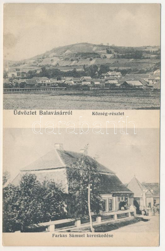 Balavásár, Balauseri; község-részlet, látkép, Farkas Sámuel kereskedése és saját kiadása, Lang Henrik fényképészeti műterméből / general view, shop (EK)