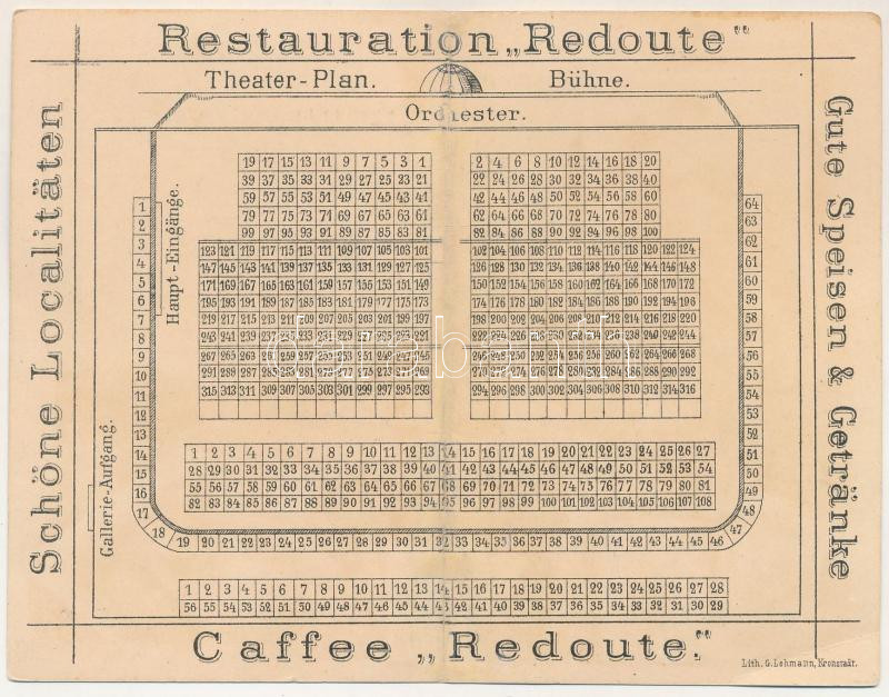Brassó, Kronstadt, Brasov; Wilhelm Hiemesch Buchhandlung und Leihbibliothek, Restauration Redoute, Theater-Plan, Bühne, Cafee. Lith. G. Lehmann No. 32. / Wilhelm Hiemesch könyvkiadó reklámlapja, hátoldalon a Városi Vigadó és étterem, kávéház (Redoute) alaprajza / book publishing advertisement, with the plan of Redoute restaurant and café on the backside. Art Nouveau, floral, litho (non PC) (r)