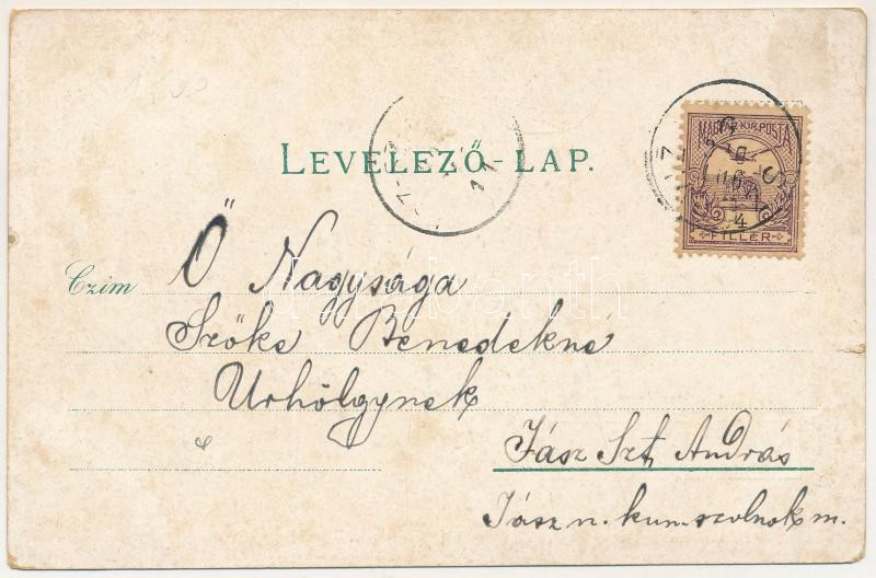 Leírás: Csíksomlyó, Sumuleu Ciuc; látkép, kegytemplom, gimnázium, nevelőintézet, Mária szobra. Gregor Fischer kiadása / general view, pilgrimage church, grammar school, boarding school, Virgin Mary statue. Art Nouveau, floral (szakadás / tear)