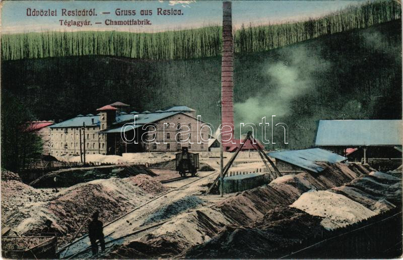 Leírás: Resicabánya, Resicza, Recita, Resita; Téglagyár, iparvasút. Boskovitz Irén kiadása / Chamottfabrik / brickyard, brick factory, industrial railway (ázott / wet damage)