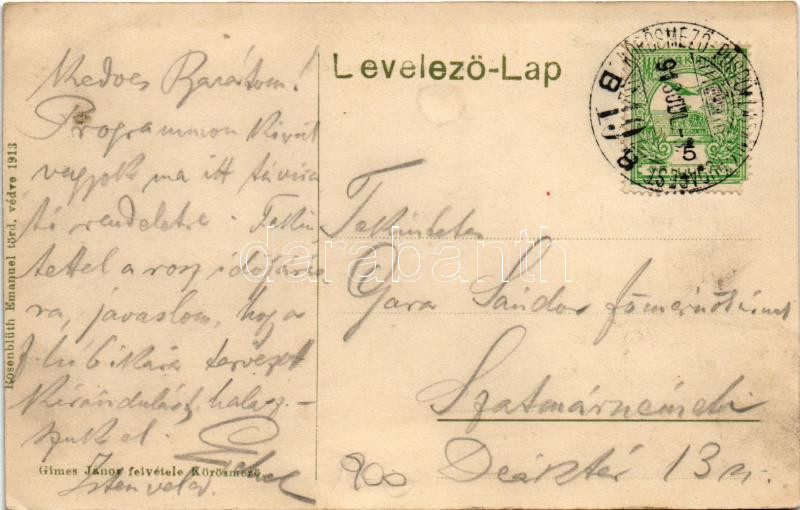 Leírás: 1913 Kőrösmező, Jaszinya, Jasina, Yasinia; Kozmescseki vízfogógát. Gimes János felvétele, Rosenblüth Emanuel kiadása / dam + "KŐRÖSMEZŐ - PÜSPÖKLADÁNY - BUDAPEST 19 B" vasúti mozgóposta bélyegző