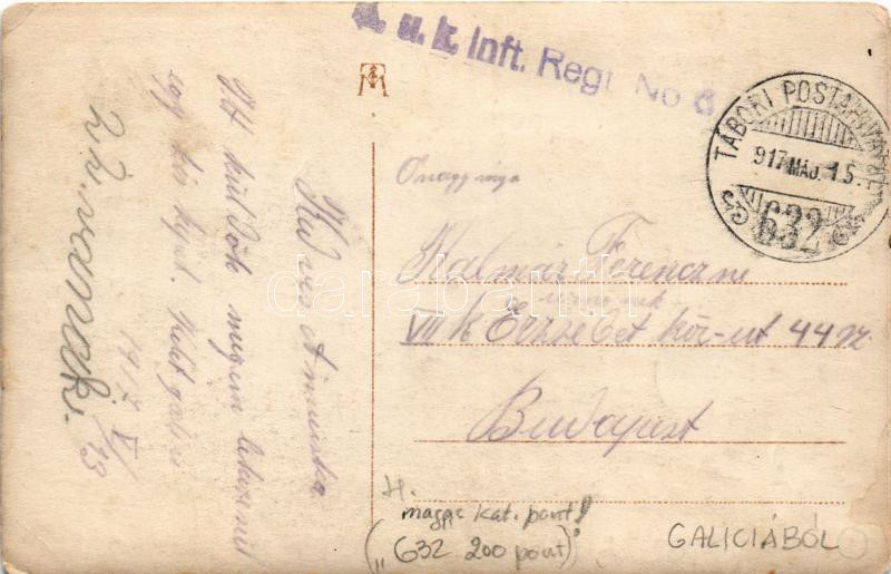 1917 Osztrák-magyar katonák csoportképe Kelet-Galíciában / WWI K.u.K. military, group of soldiers in East Galicia. photo + "TÁBORI POSTAHIVATAL 632" (kopott sarkak / worn corners)