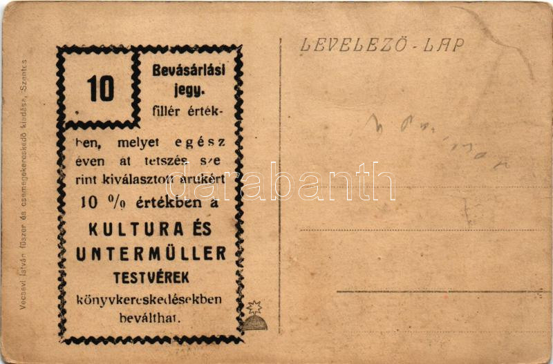 Szentes, Új római katolikus elemi népiskola, Erzsébet park, cukrászda, női kalap üzlet, Pázmány Géza üzlete, hátoldalon Bevásárlási hegy 10 fillér értékben, beváltható a Kultúra és Untermüller Testvérek üzletében. Vecsevi István kiadása (felületi kopás / worn surface)