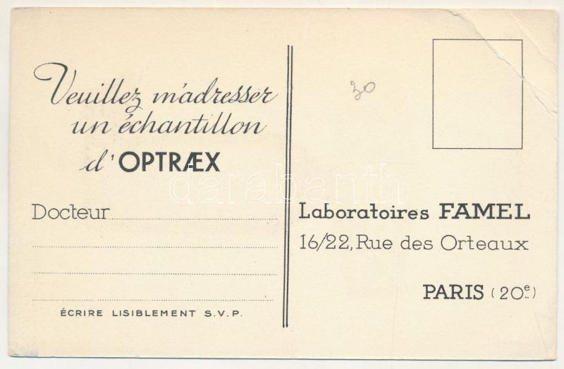Optraex, Bain Oculaire - Laboratories Famel, Paris / Francia gyógyszer... https://www.darabanth.com/hu/512-Gyorsarveres/512.0/Kepeslapok/Reklam~183/Optraex-Bain-Oculaire-Laboratories-Famel-Paris-Francia-gyogyszer-reklam-French-medicine-ad~II3463462
