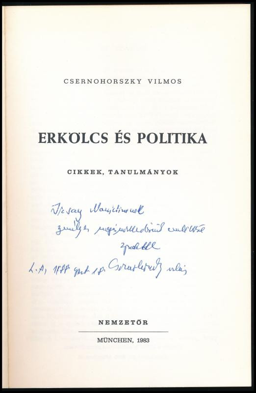 Leírás: Csernohorszky Vilmos: Erkölcs és politika. Cikkek, tanulmányok. A szerző, Csernohorszky Vilmos (1929-2011) orvos, sebész, aneszteziológus által dedikált példány. München, 1983, Nemzetőr. Emigráns kiadás. Kiadói papírkötés.