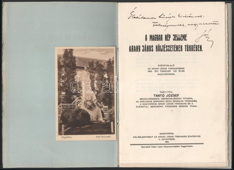 Tantó József: A magyar nép jelleme Arany János költészetének tükrében. Székfoglaló az Arany János Társaságban 1930. évi február hó 16-án Nagykőrösön. Tartotta: - - . A szerző,Tantó (Tanthó) József (1888-1973), Békés vármegye népművelési titkára által felesége részére dedikált példány. Nagykőrös, 1931, Dajka Lajos-ny., 20 p. Kiadói zsinórfűzéses papírkötés.