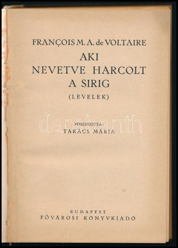 Voltaire: Aki nevetve harcolta sírig. (Levelek.) Bp., Fővárosi Könyvki... https://www.darabanth.com/hu/512-Gyorsarveres/512.0/Konyvek/Konyvek-Egyeb-ritkasagok~690/Voltaire-Aki-nevetve-harcolta-sirig-Levelek-Bp-Fovarosi-Konyvkiado-Kiadoi-egeszvaszo~II3459026