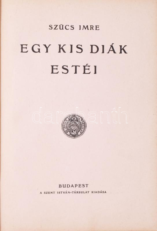 Szücs Imre: Egy kis diák estéi. Bp., [1941], Szent István-Társulat, 202 p. Egyetlen kiadás. A borító és a rajzok Márton Lajos munkái. Kiadói illusztrált félvászon-kötés, 1942-es ajándékozási bejegyzéssel.