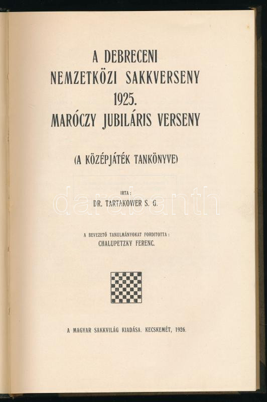 Dr. Tartakower S. G.: A Debreceni Nemzetközi Sakkverseny 1925. Maróczy Jubiláris Verseny. Kecskemét, 1926, Magyar Sakkvilág. Félvászon kötés, kissé kopottas állapotban.
