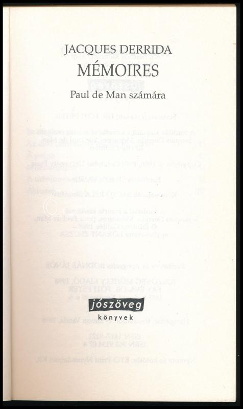 Jacques Derrida: Mémoires Paul de Man számára. Jószöveg Műhely Kiadó, ... https://www.darabanth.com/hu/512-Gyorsarveres/512.0/Konyvek/Konyvek-Tarsadalomtudomany~677/Jacques-Derrida-Memoires-Paul-de-Man-szamara-Joszoveg-Muhely-Kiado-1998-Kiadoi-papirko~II3458871