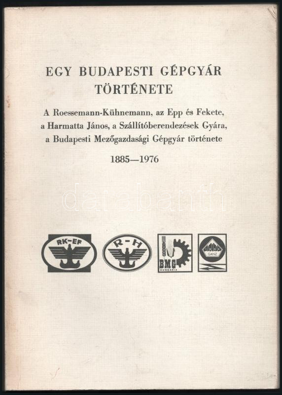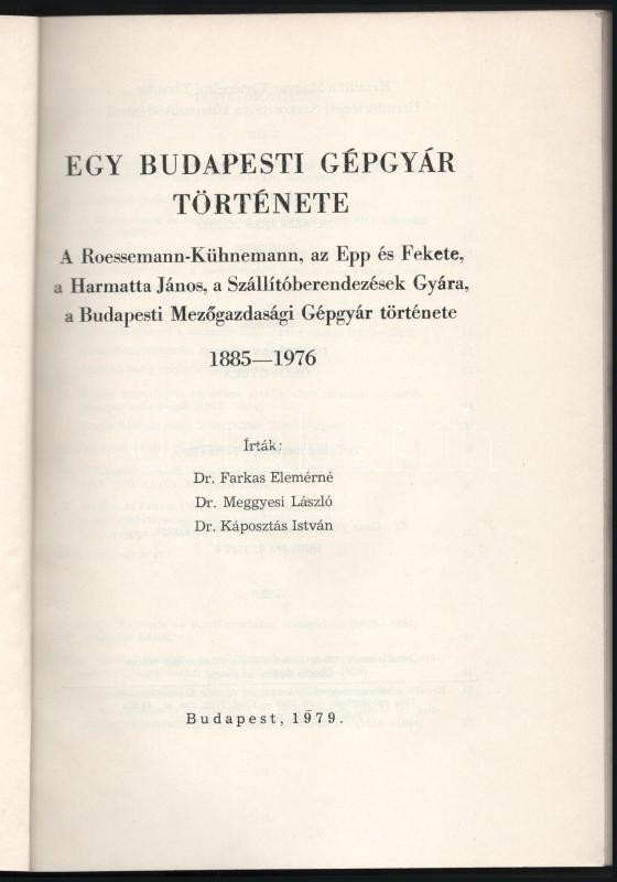 Farkas Elemérné dr. Meggyesi László dr. Káposztás István dr.: Egy budapesti gépgyár története - A Roessemann-Kühnemann, az Epp és Fekete, a Harmatta János, a SzállÃtóberendezések Gyára, a Budapesti MezÅ‘gazdasági Gépgyár története 1885-1976 Budapest, 1979. Kiadói papÃrkötés, jó állapotban.