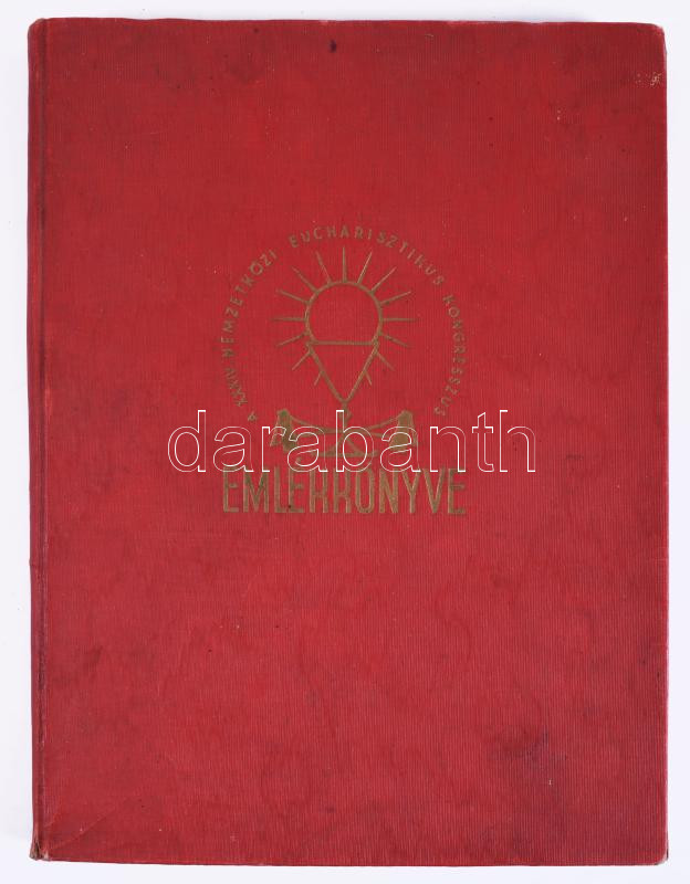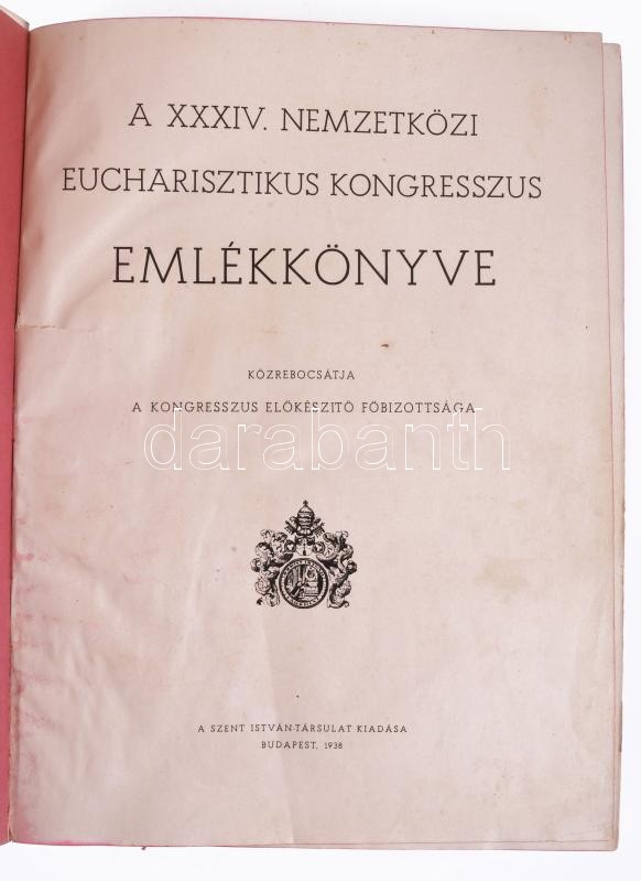 A XXXIV. Nemzetközi Eucharisztikus Kongresszus emlékkönyve. Közrebocsátja a Kongresszus ElÅ‘készÃtÅ‘ FÅ‘bizottsága. Bp., 1938, Szent István-Társulat. Kiadói egészvászon kötés, gerinc sérült, szÃnezett lapszélek, kopottas állapotban.
