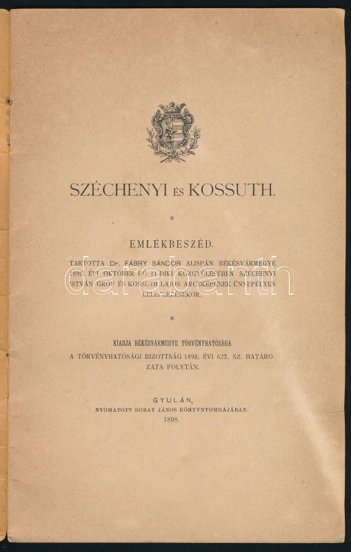 Fábry Sándor: Széchenyi és Kossuth. Emlékbeszéd. Tartotta Dr. - - alispán Békésvármegye 1898. évi október hó 11-diki közgyűlésében Széchenyi István gróf és Kossuth Lajos arczképének ünnepélyes leleplezésekor. Kiadja Békésvármegye törvényhatósága. Gyula, 1898, Dobay János-ny., 17+(3) p. Kiadói tűzött papÃrkötés, kissé sérült, foltos borÃtóval.