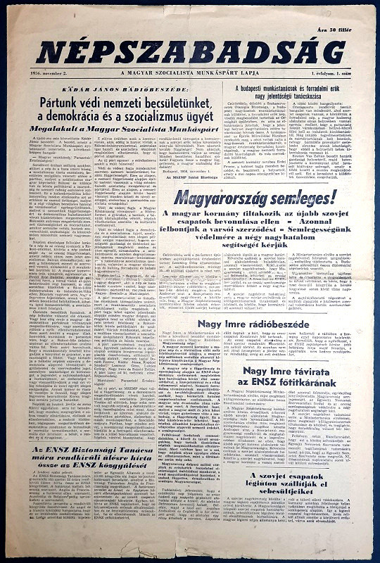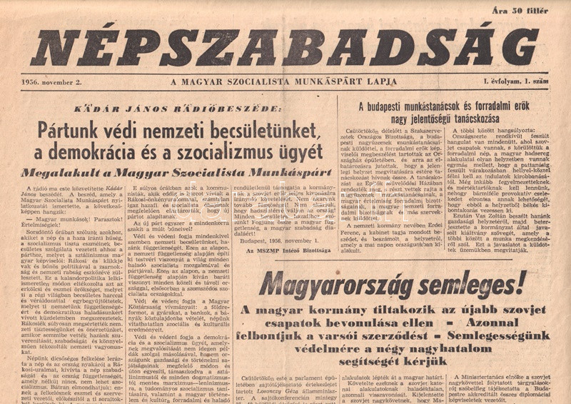 [Folyóirat, 1956.] Népszabadság. A Magyar Szocialista Munkáspárt lapja. I. évfolyam, 1. szám. (1956. november 2.) [Kádár János rádióbeszéde: Megalakult a Magyar Szocialista Munkáspárt. Vegyétek fel a munkát! Maléter Pál felhívása. Nagy Imre rádióbeszéde.]