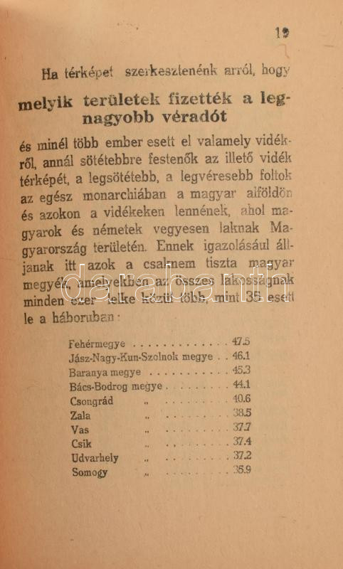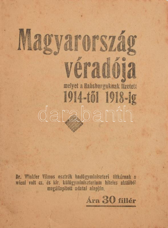 Magyarország véradója melyet a Habsburgoknak fizetett 1914-től 1918-ig. Dr. Winkler osztrák hadügyminiszter titkárának a wieni volt cs. és kir. külügyminisztérium hiteles aktáiból megállapított adatai alapján. Bp.,(1919), Uránia-ny., 31 p. Kiadói papírkötés, kissé foltos címlappal, jó állapotban. Ritka!