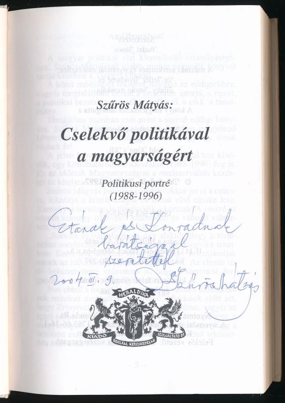 Szűrös Mátyás: Cselekvő politikával a magyarságért. Politikusi portré (1988-1996). A szerző, Szűrös Mátyás (1933- ) politikus, diplomata, az MSZMP vezető politikusa, az Országgyűlés elnöke, a Magyar Köztársaság ideiglenes köztársasági elnöke, országgyűlési képviselő által dedikált példány. Bp., 1997, Heraldika. Kiadói kartonált papírkötés.