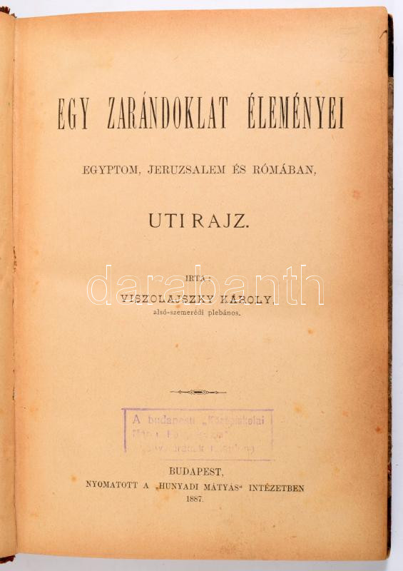 Viszolajszky Károly: Egy zarándoklat élményei. Egyiptom, Jeruzsálem és Rómában. Útirajz. Bp., 1887, Hunyadi Mátyás Intézet. Félbőr kötés, kopottas állapotban.